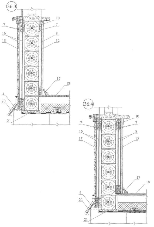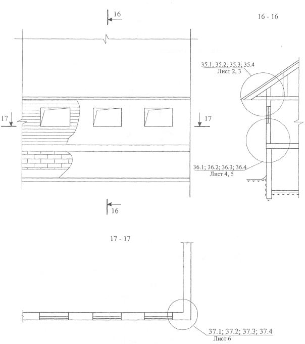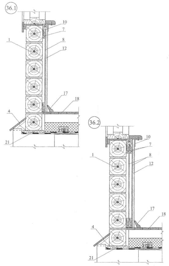 СХЕМА №11. Общий вид и разрезы стены из бруса М24.40/05 - 4.1 Стены деревянные из бруса Новое строительство и Реконструкция Схема 11 Узел 35 - 37
