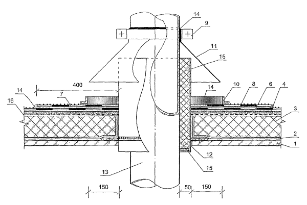 Рис.1.3. Воронка у примыкания кровли к парапету 1 - покрытие по типу К-2 (см. табл.1); 2 - основной водоизоляционный ковер; 3 - дополнительные слои ковра; 4 - костыль (полоса 4×40 мм); 5 - защитный фартук; 6 - бортик из цементно-песчаного раствора; 7 - опора из легкого бетона; 8 - местное понижение воронки; 9 - хомут; 10 - стекловата; 11 - стена; 12 - колпак водоприемной воронки; 13 - ограждение; 14 - патрубок с фланцем; 15 - герметизирующая мастика; 16 - уплотнитель.