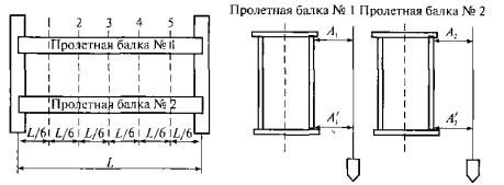 3. К верхнему поясу пролетной балки в середине моста (или в крайнем рабочем вылете консоли козлового крана) прикрепляют стальную струну с грузиком, который обеспечивает ее натяжение. Для отсчета величины деформации на полу здания (или на земле) рядом с грузиком в вертикальном направлении закрепляют линейку таким образом, чтобы перемещения подвешенного грузика можно было отсчитывать по ее шкале.