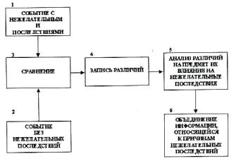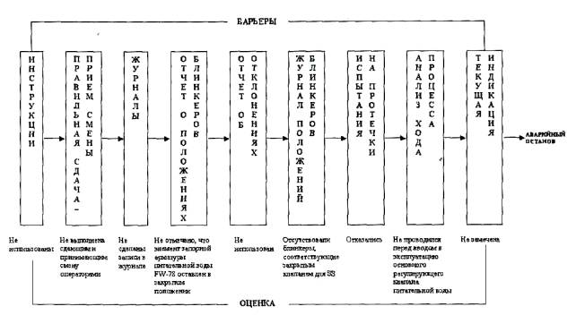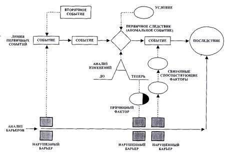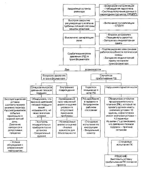 Рисунок 3 - Диаграмма события и причинных факторов 5.2.6 Метод "Анализ дерева отказов" Этот метод является систематизированным подходом (упрощенная версия), подобным методу "Анализ управленческого надзора и дерева рисков" (МОRT), который может быть использован в том случае, когда проблема известна, а причины не ясны. Он использует набор вопросов, помогающих аналитику определить причины. Главным преимуществом этого метода является уменьшение объема технической экспертизы в области происшедшего, так как вопросы формулируются перед началом расследования. Положительные стороны: - может быть использован при ограниченной подготовке; - представление информации о нарушении в собранном (контактном) виде; - полезен для решения проблем реализации программ (повышения безопасности и т.д.); - дает структуру события и определяет точки логических связей. Ограничения: - может идентифицировать только область причин; - потенциально поверхностный; - может вызвать упрощение задачи и ограничить идентификацию других способствующих факторов. Описание этого метода представлено в приложении Е. 5.2.7 Метод "Психологический анализ причин неправильных действий персонала" Данный метод разработан ОНИЦ "Прогноз" для анализа коренных причин неправильных действий персонала, приведших к нарушению. Метод использует основную идею методологии АССЕТ о необходимости всесторонней экспертизы и систематического анализа причин событий на АС и включает в себя: - наблюдение за нарушениями, связанными с человеческим фактором, и изучение нарушений, в которых персонал предотвратил аномальные события; - предоставление комиссиям по расследованию нарушений научно обоснованных данных о неправильных действиях персонала и их коренных причинах для учета в работе и при подготовке заключения по итогам расследования; - выявление общих закономерностей в причинах событий, связанных с человеческим фактором, и выработка рекомендаций по предотвращению неправильных действий персонала АС путем использования накопленных данных об ошибках (неправильных действиях) персонала. Положительные стороны: Метод определяет состояние факторов надежности профессионального функционирования работника АС, включая факторы мотивации и психологической готовности к действиям, личностные профессионально важные качества, характеристики профессиональной подготовки, психофизиологическое состояние и внешние условия, которые могут провоцировать неправильное действие. В каждом конкретном случае специалист по человеческому фактору: - изучает психологические обстоятельства (внутренние, психологические факторы) и объективные внешние условия, предопределившие совершение неправильного действия; - регистрирует категории неправильных (ошибочных) действий по типам: а) случайная ошибка-промах; б) ошибка по незнанию; в) сознательно неправильное действие или мотивационная ошибка; - отвечает на вопросы: "Что произошло?", "Как произошло?" и "Почему произошло?" в действиях персонала, послуживших причиной аномального события; - выдает заключение по психологическим аспектам непосредственных и коренных причин неправильных действий персонала. В процессе расследования причин событий специалист по человеческому фактору определяет: - события-проявления недостатков персонала; - непосредственные причины соб