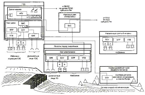Рис.2.3. Организация локальной системы оповещения в районе размещения ГЭС 2.2.4. Управление локальной системой оповещения на потенциально опасном объекте осуществляется с пультов, расположенных на основном и запасном пунктах управления (ЗПУ) потенциально опасного объекта. 2.2.5. Рабочее место дежурного диспетчера (начальника смены) потенциально опасного объекта оборудуется техническими средствами, обеспечивающими: управление локальной системой оповещения; прямую телефонную и, при необходимости, радиосвязь с оперативными дежурными органов управления по делам гражданской обороны и чрезвычайным ситуациям субъекта Российской Федерации, города или городского района; прямую проводную и радиосвязь дежурного диспетчера с оперативным персоналом систем аварийной сигнализации и контроля, а также с дежурными сменами аварийно-спасательных служб потенциально опасного объекта; прием сообщений, передаваемых по территориальной системе централизованного оповещения; контроль прохождения сигналов и информации, передаваемых по локальной системе оповещения; телефонную связь общего пользования. 2.2.6. Технические средства локальных систем оповещения должны находиться в режиме постоянной готовности к передаче сигналов и информации оповещения и обеспечивать автоматизированное включение оконечных средств оповещения по сигналам территориальной автоматизированной системы централизованного оповещения и от дежурного диспетчера (начальника смены) потенциально опасного объекта. 2.2.7. При создании локальных систем оповещения необходимо предусматривать их организационное, техническое и программное сопряжение с территориальной автоматизированной системой централизованного оповещения субъекта Российской Федерации, системами аварийной сигнализации и контроля потенциально опасного объекта. 2.2.8. Зоны действия локальных систем оповещения определяются в соответствии с действующими нормативными документами и с учетом особенностей построения сетей связи и вещания в районе размещения потенциально опасного объекта: в районах размещения ядерно - и радиационно-опасных объектов - в радиусе 5 км вокруг каждого из объектов (включая поселок у объекта); в районах размещения химически опасных объектов в радиусе до 2,5 км вокруг каждого из объектов; в районах размещения гидротехнических объектов (в нижнем бьефе, в зонах затопления) - на расстоянии до 6 км от каждого объекта. 2.3. Порядок задействования локальной системы оповещения2.3.1. Решение на задействование локальной системы оповещения принимает руководитель потенциально опасного объекта или лицо его замещающее. В исключительных случаях, не терпящих отлагательства, решение о задействовании локальной системы оповещения может быть принято дежурным диспетчером (начальником смены станции) потенциально опасного объекта. 2.3.2. При задействовании локальных систем оповещения должен соблюдаться следующий порядок: подается сигнал «Внимание всем!» путем дистанционного включения электросирен; передается команда дистанционного включения электропитания усилителей проводного вещания и переключения их на передачу информации оповещения; с микрофона или ПЭВМ осуществляется многократная (2 - 3 раза) передача речевой информации оповещения; длительность передачи речевой информации оповещения не долж