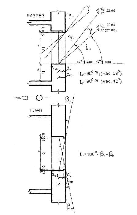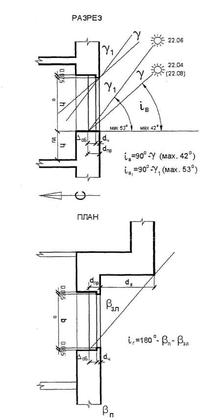 При значительной глубине горизонтальных затеняющих элементов фасада продолжительность инсоляции определяется графическим методом на разрезе и плане светового проема (см. рисунок Б.5). Глубину балкона (лоджии) помещения ориентированного на юг не препятствующего проникновению солнечных лучей предварительно можно определить, умножив расстояние от подоконника до потолка на 0,75 и уменьшив результат на величину глубины проема dпр.