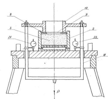 2 - контейнер; 3 - грунт; 8 - штамп; 9 - пробка; 10 - кольцевой переходник; 11 - силовая рама; 21, 22 - мессуры.