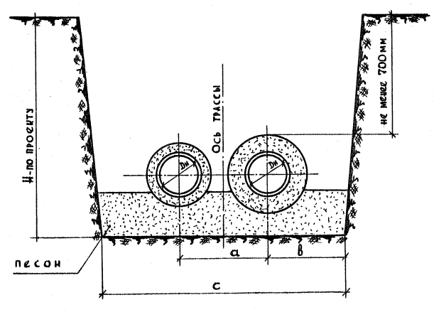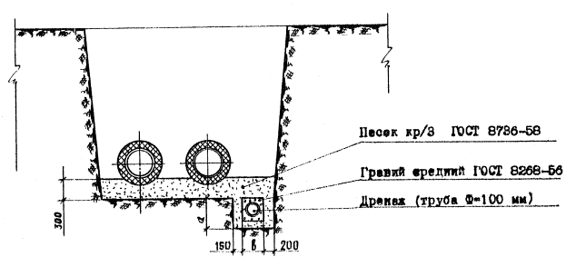 УКАЗАНИЯ ПО ПРОИЗВОДСТВУ РАБОТ. Подготовка основания под тепловые сети производится вслед за разработкой траншеи. При подготовке дна траншеи необходимо произвести срезку недобора грунта после экскаватора. После срезки по дну траншеи устраивается песчаная подушка толщиной 10 - 15 см. В насыпных, торфяных и других слабых грунтах песчаная подушка укладывается на слой утрамбованного щебня, гравия или тощего бетона толщиной 10 см. Затем песок уплотняют и планируют до проектной отметки. Песок, щебень, гравий должны быть завезены на объект заранее и разложены на бровке вдоль траншеи. Бетон подвозится по мере надобности. Качество основания принимается представителями заказчика, проектной и эксплуатационной организаций и оформляется актом. СХЕМА ПОПУТНОГО ДРЕНАЖА ПРИ ПРОКЛАДКЕ ТРУБОПРОВОДОВ ТЕПЛОСЕТИ В МОКРЫХ ГРУНТАХ