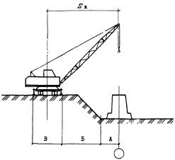 А - расстояние от оси фундамента до основания откоса Б - расстояние от основания откоса до ближайшей опоры крана или края дорожной плиты под опорой (по таблице 3 пункта 3.8 СНиП III-4-80 «Техника безопасности в строительстве» В - размер опорного контура дня кранов с выносными опорами (или колеи кранов, работающих без заносных опор) Sк- привязка крана к оси фундаментов Sк = А + Б + 0,5В
