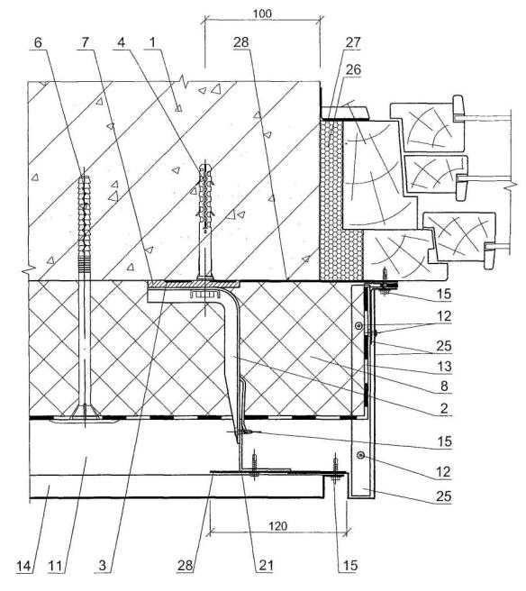 4. СТЕНЫ С ЭКРАНОМ ИЗ ПЛИТОК4.1. Решения стен с вентилируемой воздушной прослойкой разработан на примере материалов фирмы «КЕМОПЛАСТ» и имеют технические свидетельства: ТС-07-0754-03/2; ТС-07-1013-04. 4.2. Стены с вентилируемой воздушной прослойкой включают несущую часть, выполненную из полнотелого керамического кирпича, бетонных блоков или из монолитного железобетона, металлический каркас, теплоизоляционный слой из минерало- или стекловолокнистых плит, ветрозащитную пленку и облицовочные плитки. 4.3. Каркас состоит из кронштейнов, Т-образного и L-образного вертикального профиля и кляммеров для закрепления облицовки. 4.4. Кронштейны и профили, а также кляммеры для крепления плит облицовки должны изготавливаться из нержавеющей или оцинкованной стали. Толщина прижимов кляммеров должна составлять не менее 1 мм, ширина прижима - не менее 10 мм. 4.5. Кронштейн вилочного типа с максимальным вылетом от 40 до 300 мм с шагом 20 мм. 4.6. Шаг кронштейнов по горизонтали рекомендуется принимать равным 600 мм, а по вертикали не менее 1400 мм. 4.7. Кронштейны крепят к несущей части стены анкерными дюбелями, число которых определяется расчетом, исходя из величины ветровой нагрузки и веса облицовки с каркасом. 4.8. Стандартная длина Т-образного профиля составляет 3000 мм. Направляющие закрепляют к кронштейнам самонарезающими винтами. При этом свободный конец направляющей от места закрепления к кронштейну не должен превышать 300 мм. 4.9. Стык направляющих по вертикали осуществляется с помощью вставок. При этом между направляющими предусматривается зазор в 8¸10 мм. 4.10 При скрытом креплении материалов облицовочного слоя после установки в проектное положение вертикальных направляющих к ним крепят на заклепках горизонтальные направляющие. 4.11. Минераловатные плиты теплоизоляции крепят к несущей части стены тарельчатыми дюбелями. Схема установки плит теплоизоляции и тарельчатых дюбелей представлена на чертеже М24.13/05-1.2. 4.12. При открытом креплении облицовочных плит кляммеры располагаемые с шагом, соответствующим размеру облицовочных плит, крепят к направляющему профилю на заклепках. При этом конструкция кляммера определяет величину горизонтального зазора между плитами облицовки равную 4 мм. Вертикальный зазор между плитами также принимается равным 4 мм. 4.13. При скрытом креплении на плитах облицовки для их навески на горизонтальные направляющие устанавливают опорные элементы. Опорный элемент крепится посредством самозапирающейся втулки, которая вставляется в предварительно рассверленное в плите отверстие 4.14. Фиксация плит в проектном положении обеспечивается по вертикали регулировочным винтом опорного элемента, а по горизонтали - посредством свободного перемещения опорного элемента вдоль горизонтальной направляющей. 4.15. При облицовочном слое из металлических кассет перед их установкой внутрь Т-образного профиля вставляют салазки имеющие поперечный штифт. Салазки крепят к направляющим двумя заклепками. 4.16. После навески на штифты кассету выравнивают согласно проектному положению и крепят заклепками через верхний отгиб кассеты к направляющим. 4.17. Для ветро- и гидрозащиты минерало- и стекловолокнистого утеплителя в системах с вентилируемым фасадом рекомендуется применять пленку марки «Tyvek® Housewrap», возможно также применение «Tyvek® Solid» и «Tyvek® Supro». 4.18. Монтаж мат