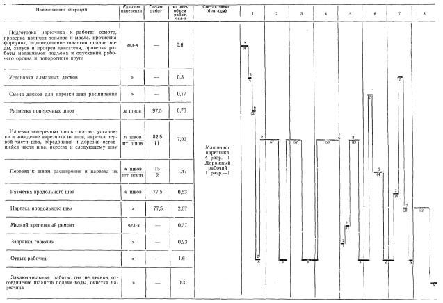 деформационных швов в цементобетонных дорожных покрытиях» 2. «Руководство по организации труда при производстве строительно-монтажных работ. Глава 28. Дорожные работы». М„ 1971. III. УКАЗАНИЯ ПО ОРГАНИЗАЦИИ ТРУДАНарезчик швов ДНШС-60-3М обслуживают машинист 5 разр. и бетонщик 4 разр., которые привлекаются к нарезке швов в свежеуложенном бетоне периодически по мере необходимости. Машинист является старшим в звене и ответственным за качество устройства и отделки швов. Во время нарезки швов он управляет машиной, наблюдает за правильной работой рабочих органов, следит за тем, чтобы лента хорошо сцеплялась с бетоном. Он заправляет ленту в прорезь вибропластины и выполняет другие операции, связанные с нарезкой швов. В начале смены машинист готовит машину к работе, а в конце смены очищает ее. Бетонщик заправляет ленту в фиксатор и придерживает его рукой при нарезке в начале шва, обрезает ленту, извлекает фиксатор, очищает его от бетонной смеси, обрабатывает поверхность покрытия у шва и в местах сопряжения. Бетонщик периодически очищает и промывает водой вибропластину и резиновую гладилку. В начале и в конце смены помогает машинисту в подготовке машины к работе, уборке рабочего места, а также нарезает рулонный полиэтилен па ленты и сращивает концы лент для продольных швов. В свободное время машинист нарезчика ДНШС-60-3М управляет машиной ЭНЦ-3 для розлива пленкообразующих материалов при уходе за бетоном, а бетонщик 4 разр. помогает бетонщикам в окончательной отделке поверхности и кромок бетонного покрытия. IV. ГРАФИК УСТРОЙСТВА КОНТРОЛЬНЫХ ШВОВ С ЭЛАСТИЧНЫМИ ПРОКЛАДКАМИ НАРЕЗЧИКОМ ДНШС-60-3М В ЦЕМЕНТОБЕТОННОМ ПОКРЫТИИ ШИРИНОЙ 7,5 м НА ДВУХ СМЕННЫХ ЗАХВАТКАХ ДЛИНОЙ 310 и (67,5 м ШВОВ)