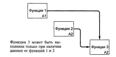 6.8 Текст и глоссарийДиаграмме может быть поставлен в соответствие структурированный текст, представляющий собой краткий комментарий к содержанию диаграммы. Текст используется для объяснений и уточнений характеристик, потоков, внутриблочньх соединений и т.д. Текст не должен использоваться для описания и без того понятных блоков и стрелок на диаграммах. При большом объеме текст располагается на отдельном листе модели (текстовой странице). Глоссарий предназначен для определения аббревиатур, ключевых слов и фраз, используемых в качестве имен и меток на диаграммах. Глоссарий определяет понятия и термины, которые должны быть одинаково понимаемы всеми участниками разработки и пользователями модели, чтобы правильно интерпретировать ее содержание. Глоссарий составляется с любой необходимой степенью подробности. 6.9 Диаграммы-иллюстрации (FEO)Эти диаграммы используются в качестве дополнений, поясняющих специфику содержания основных диаграмм в случаях, когда это необходимо. Диаграмма FEO не должна подчиняться синтаксическим правилам IDEF0. 7 Свойства диаграмм7.1 Стрелки как ограниченияСтрелки на диаграмме IDEF0, представляя данные или материальные объекты, одновременно задают своего рода ограничения (условия). Входные и управляющие стрелки блока, соединяющие его с другими блоками или внешней средой, описывают условия, которые должны быть выполнены для того, чтобы реализовалась функция, записанная в качестве имени блока. Рисунок 8 иллюстрирует случай, при котором «функция 3» может быть выполнена только после получения данных, выработанных «функцией 1» и «функцией 2».