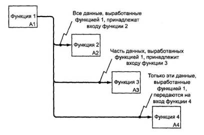 Рисунок 9 7.3 Ветвление и слияние сегментов стрелокВетвление и слияние стрелок призвано уменьшить загруженность диаграмм графическими элементами (линиями). Чтобы стрелки и их сегменты правильно описывали связи между блоками-источниками и блоками-потребителями, используется аппарат меток. Метки связываются с сегментами посредством тильд. При этом между сегментами возникают определенные отношения, описанные ниже: - непомеченные сегменты (рисунок 10) содержат все объекты указанные в метке стрелки перед ветвлением (то есть все объекты принадлежат каждому из сегментов)
