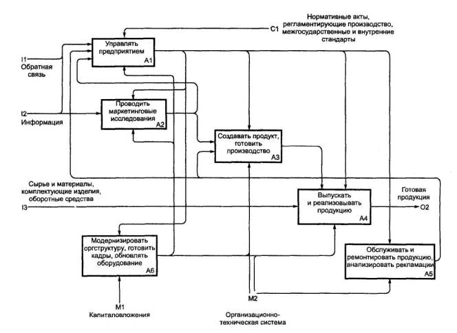 acquisition and life-cycle support. Дата введения 2002-07-011 Область примененияНастоящие рекомендации по стандартизации предназначены для использования при анализе и синтезе производственно-технических и организационно-экономических систем методами функционального моделирования в различных отраслях экономики. Рекомендации содержат описание комплекса средств для наглядного представления широкого спектра деловых, производственных и других процессов и операций предприятия на любом уровне детализации, а также организационные и методические приемы применения этих средств. 2 ОпределенияВ настоящих рекомендациях применяют следующие термины: 2.1 блок: Прямоугольник, содержащий имя и номер и используемый для описания функции. 2.2 ветвление: Разделение стрелки на два или большее число сегментов. Может означать «развязывание пучка» (см. 2.27). 2.3 внутренняя стрелка: Входная, управляющая или выходная стрелка, концы которой связывают источник и потребителя, являющиеся блоками одной диаграммы. Отличается от граничной стрелки. 2.4 входная стрелка: Класс стрелок, отображающих вход IDEF0-блока, то есть данные или материальные объекты, которые преобразуются функцией в выход. Входные стрелки связываются с левой стороной блока IDEF0. 2.5. выходная стрелка: Класс стрелок, отображающих выход IDEF0-блока, то есть данные или материальные объекты, произведенные функцией. Выходные стрелки связываются с правой стороной блока IDEF0. 2.6 глоссарий: Список определений для ключевых слов, фраз и аббревиатур, связанных с узлами, блоками, стрелками или с моделью IDEF0 в целом. 2.7. граничная стрелка: Стрелка, один из концов которой связан с источником или потребителем, а другой не присоединен ни к какому блоку на диаграмме. Отображает связь диаграммы с другими блоками системы и отличается от внутренней стрелки. 2.8 декомпозиция: Разделение моделируемой функции на функции-компоненты. 2.9 дерево узлов: Представление отношений между родительскими и дочерними узлами модели IDEF0 в форме древовидного графа. Имеет то же значение и содержание, что и перечень узлов (см. 2.23). 2.10 диаграмма А-0 (А минус ноль): Специальный вид (контекстной) диаграммы IDEF0, состоящей из одного блока, описывающего функцию верхнего уровня, ее входы, выходы, управление, и механизмы, вместе с формулировками цели модели и точки зрения, с которой строится модель. 2.11 диаграмма: Часть модели, описывающая декомпозицию блока. 2.12 диаграмма-иллюстрация (FEO): Графическое описание, используемое для сообщения специфических фактов о диаграмме IDEF0. При построении диаграмм FEO можно не придерживаться правил IDEF0. 2.13 дочерний блок: Блок на дочерней (порожденной) диаграмме. 2.14 дочерняя диаграмма: Диаграмма, детализирующая родительский (порождающий) блок. 2.15 имя блока: Глагол или глагольный оборот, помещенный внутри блока и описывающий моделируемую функцию. 2.16 интерфейс: Разделяющая граница, через которую проходят данные или материальные объекты; соединение между двумя или большим числом компонентов модели, передающее данные или материальные объекты от одного компонента к другому. 2.17 код ICOM (аббревиатура Input - вход, Control - управление, Output - выход, Mechanism - механизм): Код, обеспечивающий соответствие граничных стрелок дочерней диаграммы со стрелками родительского блока; используется для ссылок. 2.18 контекст: Окружающая среда, в которой действует функция