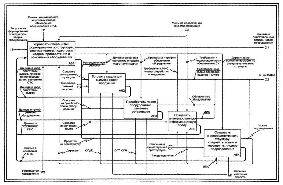 Организационно-техническая система - организационная структура, персонал и комплекс технических средств (оборудование), необходимые для осуществления деятельности. Организационно-техническая подсистема - часть организационно-технической системы, обеспечивающая протекание процесса (субдеятельности). Организационно-технический комплекс (модуль) - часть организационно-технической подсистемы, предназначенная для выполнения операции. Организационно-технический блок - часть организационно-технического комплекса, обеспечивающая выполнение действия. Таким образом, при корректном построении модели (без априорной привязки к «организации») появляется возможность связать ее блоки на разных уровнях декомпозиции с объектами организационно-технической структуры, выступающими в качестве механизмов. В этом случае организационно-техническая структура становится результатом функционального моделирования. Во многих моделях находит или должно находить отражение явление, состоящее в формировании или специфической настройке (перестройке) механизмов в ходе деятельности. Это явление часто именуется реинжинирингом производства и/или бизнес-процессов на предприятии (в организации). Явление отражается в модели как субдеятельность, поскольку почти всегда состоит из нескольких процессов. Укрупненная схема этой субдеятельности приведена на рисунке 40.