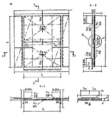 Рис. 43. Сборно-монолитная плита а ¾ схема армирования сборно-монолитной плиты, защемленной по контуру; б — конструктивное решение сборной плиты скорлупы без внешнего армирования; в ¾ то же, с внешним армированием СВ — сетка верхнего армирования, ПС — плита-скорлупа 1 — монтажная петля, 2 — петлевые выпуски Расчет железобетонных плит перекрытий 6.22. При расчете железобетонных плит перекрытий по предельным состояниям первой группы (по прочности) и второй группы (по деформациям, образованию и раскрытию трещин) рекомендуется различать плиты, работающие на изгиб из плоскости в одном и двух направлениях. Плиты, опертые по контуру и имеющие соотношение размеров длинной стороны к короткой 3:1 и менее, а также плиты, опертые по трем сторонам и имеющие соотношение размеров вдоль параллельно расположенных опор к размеру вдоль свободного края 1,5:1 и менее, рекомендуется рассчитывать как работающие на изгиб из плоскости в двух направлениях. Расчет таких плит разрешается выполнять методами, изложенными в настоящем Пособии. При необходимости уточненный расчет таких плит может выполняться по специальным программам на ЭВМ, учитывающим нелинейную работу железобетона с трещинами. Остальные плиты рекомендуется рассчитывать как работающие на изгиб в одном направлении по СНиП 2.03.01—84 и соответствующим пособиям. 6.23. Для плит, работающих на изгиб из плоскости в двух направлениях, различаются расчетные длины l1 и l2. Для плит, опертых по контуру, принимается, что пролет l1 не превышает пролет l2. Для плит, опертых по трем сторонам, пролет соответствует расстоянию между параллельно расположенными опорами (размер вдоль свободного края плиты). Для свободно опертых плит расчетный пролет принимается равным расстоянию между серединами опорных площадок плит перекрытий. Для защемленных на опорах плит расчетный пролет принимается равным пролету в свету (до грани опор). 6.24. Для плит перекрытий, работающих на изгиб в двух направлениях, коэффициенты армирования (отношение площади сеченая арматуры к рабочей площади сечения плиты, перпендикулярного арматуре) m1 и m2 вдоль пролетов соответственно l1 и l2 рекомендуется назначать так, чтобы выполнялись условия: m1 ³ mmin;. (149) 0,5 (m1 + m2 ³ mmin, (150) где mmin — минимальное значение коэффициента армирования, принимаемое по CHиП 2.03.01—84 равным 0,05 %. Для железобетонных слабоармированных элементов, несущая способность которых исчерпывается одновременно с образованием трещин в бетоне растянутой зоны, площадь сечения продольной растянутой арматуры должна быть увеличена по сравнению с требуемой из расчета по прочности не менее чем на 15 % (по СНиП 20301—84). 6.25. При расчете плит перекрытий нагрузки от веса опирающихся на них ненесущих наружных стен и перегородок рекомендуется учитывать следующим образом: для жестких ненесущих стен и перегородок в виде сборных бетонных и железобетонных панелей нагрузка от их веса прикладывается к плите в виде сосредоточенных сил, которые считаются расположенными: для панелей без проемов, а также простенков панелей с проемами шириной более половины высоты этажа — на расстоянии 1/12 длины соответственно панели и простенка от их краев; для крайних простенков панелей с проемами шириной не более половины высоты этажа — на расстоянии 1/3 от наружного края простенка, а для средних простенков — по середине их дли
