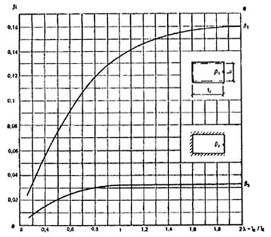 Расчет прогибов железобетонных плит 6.47. Прогибы свободно опертых по двум сторонам плит определяются по нормам проектирования железобетонных конструкций. Максимальные прогибы от длительно действующих нагрузок свободно опертых по трем или четырем сторонам плит с закрепленными от подъема углами разрешается определять по формулам: в случае, когда трещины не образуются, qcrc > qn f = jb2 l41 b1 ql/(jb1 Eb h3), (219) где b1 — коэффициент, вычисляемый по графикам на рис. 50, 51 в зависимости от схемы опирания плиты; ql — длительно действующая нагрузка, по которой проверяется прогиб плиты; Eb — начальный модуль упругости бетона плиты; h — толщина плиты;