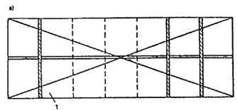 Рис. 4. Варианты механизма прогрессирующего обрушения I типа Если плиты перекрытия заведены в продольные и поперечные стены (платформенные стыки), они образуют между ними практически неразрушимую связь сдвига. В этом случае рассматриваются лишь такие разновидности механизма обрушения I типа, которые возможны при ослаблении поперечной стены дверными проемами (см. рис. 4, б, в). При этом условие (2) принимает вид WIw,in + WIp ³ UIw,in + UIp + Uw,ex, (4) где WIw,in, UIw,in — соответственно работа внутренних и внешних сил на перемещениях отдельных частей панели внутренней стены; WIp, UIp — соответственно работа внутренних и внешних сил, приложенных к плитам перекрытий; Uw,ex — работа внешних сил, приложенных к наружным панелям. Работа WIw,in определяется сопротивлением изгибу над- и подпроемных перемычек и в общем случае определяется соотношением WIw,in = (M¢sup + M¢¢sup + M'inf + M"inf)/b, (5) где M¢sup, M¢¢sup, M'inf , M"inf — соответственно прочности при изгибе левого и правого опорных сечений верхней и нижней перемычек, a b — пролет перемычек. Если поперечная стена отделена от продольной дверным проемом и связь между ними отсутствует, то WIw,in = 0. Если связь между поперечной стеной и продольной осуществляется перемычкой — «флажком» (см. рис. 4, в), то прочность левого опорного сечения (M¢sup) определяется прочностью горизонтальной линейной связи (S2); при этом прочность сдвиговой связи в соответствии с рекомендациями п. 4 должна удовлетворять условию S1 ³ l,5 M¢¢sup/b. (6) Работа Uw,in определяется весом обрушающейся части панели внутренней стены аGw,in, (где Gw,in — вес всей панели, 0 < а < 1) и приложенной к ней вертикальной нагрузкой от навесной лоджии (Gl) UIw,in = аGw,in + Gl. (7) Работа внешних и внутренних сил, приложенных к плитам перекрытий, первоначально опертых по трем сторонам, определяется их пластическим изломом по схеме, показанной на рис. 4, б, в, и вычисляется по формулам WIp = W¢Ip + W¢¢Ip; Up = U¢Ip + U¢¢Ip, (8) где