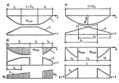 m — коэффициент, принимаемый равным: 1,2 — для прямоугольных в плане простенков; I — для простенков таврового либо двутаврового в плане сечения; I1(2) — момент инерции сечения в плане левого (правого) простенка; A1(2) — площадь сечения в плане левого (правого) простенка. В случае таврового либо двутаврового сечения за величину A1(2) принимают площадь сечения стенки тавра (двутавра) на всю ее высоту, но без учета свесов полок. С увеличением коэффициента податливости собственно перемычки относительное влияние податливости примыкающих к ней простенков уменьшается. Например, для перемычек, работающих в упругой стадии, при 2 £ l/hlin < 3 податливость простенков можно не учитывать при длине последних 3000 мм и более, а при l/hlin — при длине 2000 мм и более. 10. Коэффициент податливости перемычки в фазе образования вертикальных трещин определяют по формулам: для перемычки прямоугольного сечения (рис. 3)