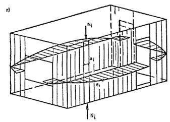 где GAk,i — жесткость при сдвиге горизонтального сечения продольных стен k-го яруса на i-м участке: Нk — высота k-го яруса; Li — длина i-го участка. Жесткость при сдвиге i-го участка сквозной продольной стены с проемами рекомендуется определять для горизонтального сечения в уровне проемов по формуле GAk,i = EiAi/(2,5 + H2o/Li), (40) где Ai, Li — соответственно площадь и длина горизонтального сечения стены на i-м участке; Hо — высота проема в стене в k-м ярусе. Жесткость при сдвиге i-го участка продольной стены, состоящей из отдельных, не связанных между собой участков, рекомендуется определять по формуле