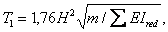 где т — масса единицы высоты здания, рассматриваемого как консольный стержень; åEIred — сумма приведенных изгибных жесткостей вертикальных диафрагм. В случае, если имеются диафрагмы, длина которых больше 0,2 высоты здания, то при определении периода колебаний необходимо учитывать влияние деформаций сдвига стен в собственной плоскости. Период первого тона в этом случае можно определять по формуле