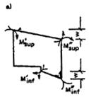 Рис. 10. Работа плит перекрытий в зданиях с железобетонными наружными стенами Для того, чтобы учесть сопротивление наружных стен прогрессирующему обрушению и связанное с ними дополнительное сопротивление плит перекрытий, нужно вычислить работу соответствующих внутренних сил (Ww,ex) по п. 14 и использовать ее при проверке условий равновесия, указанных в п. 15. 14. Для того, чтобы учесть сопротивление наружной стены прогрессирующему обрушению, нужно вычислить работу внутренних сил при разрушении панелей наружных стен типового этажа (Ww,ex). Поскольку при локальном разрушении внутренней стены прогрессирующему обрушению на каждом этаже сопротивляются две панели наружной стены (или одна двухмодульная), величина Ww,ex в общем случае рассматривается как сумма слагаемых Ww,ex = W¢w,ex + W¢¢w,ex. (22) Величина работы W¢w,ex (W¢¢w,ex) зависит от соотношения геометрических размеров панели и армирования ее перемычек и простенков, а также от наличия в ней проема для балконной двери. В общем случае любую наружную панель можно рассматривать как раму, разрушающуюся вследствие образования в ней четырех пластических шарниров (см. рис. 9, б, в), так что