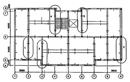 где Сj — коэффициент жесткости основания при повороте фундамента в плоскости стены; Iji ¾ момент инерции фундамента i-го участка стены относительно оси, перпендикулярной плоскости поворота фундамента. При опирании стен на свайные фундаменты с высоко расположенными ростверками жесткости при сдвиге связей необходимо определять по специальным рекомендациям. ПРИЛОЖЕНИЕ 2 РЕКОМЕНДАЦИИ ПО ОБЕСПЕЧЕНИЮ УСТОЙЧИВОСТИ КРУПНОПАНЕЛЬНЫХ ЗДАНИЙ ПРИ АВАРИЙНЫХ ВОЗДЕЙСТВИЯХ 1. Несущая система жилых зданий должна быть устойчива к прогрессирующему (цепному) разрушению в случае локального разрушения отдельных конструкций при аварийных воздействиях (взрыв бытового газа или других взрывоопасных веществ, пожар и т. п.). Это требование означает, что в случае аварийных воздействий, не предусмотренных условиями нормальной эксплуатации зданий (взрывы, пожары, ударные воздействия транспортных средств и т. п.), допускаются локальные разрушения несущих конструкций (полное или частичное разрушение отдельных стен в пределах одного этажа и двух смежных осей здания), но эти первичные разрушения не должны приводить к обрушению конструкций или к разрушению соседних несущих элементов, на которые передается нагрузка, ранее воспринимавшаяся элементами, поврежденными аварийным воздействием. Конструктивная система здания должна обеспечивать его прочность и устойчивость в случае локального разрушения несущих конструкций, как минимум на время, необходимое для эвакуации людей, Перемещение конструкций и раскрытие в них трещин не ограничивается. 2. Устойчивость здания к прогрессирующему обрушению проверяется расчетом на особое сочетание нагрузок и воздействий, включающее постоянные и временные длительные нагрузки, а также воздействие гипотетических локальных разрушений несущих конструкций. Постоянная и временная длительная нагрузка должна определяться по СНиП 2.01.07—85. При этом коэффициенты сочетаний нагрузок и коэффициенты надежности по нагрузкам к постоянным и длительным нагрузкам следует принимать равными единице. Воздействия локальных разрушений несущих конструкций учитываются тем, что из конструктивной системы здания удаляются отдельные элементы, которые могут быть разрушены при аварийных воздействиях. Для панельных жилых зданий в качестве расчетной схемы локального разрушения следует рассматривать разрушение (удаление) двух пересекающихся стен в пределах одного (любого) этажа на участках от их вертикального стыка (в частности, от угла здания) до ближайшего проема в каждой стене или до следующего вертикального стыка со стеной перпендикулярного направления. Для оценки устойчивости здания против прогрессирующего обрушения разрешается рассматривать лишь наиболее опасные расчетные схемы разрушения: локальные разрушения, включающие разрушения наружных стен, ослабленных дверными проемами выходов на балконы и лоджии (схемы 1, 2, 3 на рис. 11); локальные разрушения, включающие разрушения внутренних стен, слабо связанных с остальными вертикальными конструкциями из-за наличия дверных проемов (см. схемы 1, 4, 5 на рис. 11), из-за балочной разрезки большепролетных плиточных перекрытий (см. схемы 2, 5 на рис. 11) или из-за частичного отсутствия связей через перекрытия (стены, примыкающие к лестничным клеткам; схема 4 на рис. 11). 3. При расчете панельных з