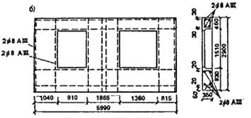 где q — равномерно распределенная нагрузка, проложенная по верху балки-стенки и соответствующая несущей способности системы по рассматриваемому нормальному сечению; Мb, Мr — предельные моменты, воспринимаемые балкой-стенкой и ригелем в рассматриваемом сечении; М¢b — момент в рассматриваемом сечении несущего элемента от нагрузки, приложенной непосредственно к элементу (включая собственный вес балки-стенки); М¢b = qol1(l ‑ l1)/2; (11) l — расчетный пролет системы, определяемый по формуле l = lo + (c1 + c2)/3; (12) lo — пролет в свету между опорами; с1, с2 —ширина левой и правой площадок опирания; l1 — расстояние до рассматриваемого сечения; Т1, T2 — предельные сдвигающие силы, воспринимаемые стыком на участках l1 и (l — l1). 15. Расчетную длину колонн (при их расчете на вертикальную нагрузку) рекомендуется принимать в зависимости от жесткости узлов между балками-стенками и колонной, жесткости дисков перекрытий и наличия диафрагм жесткости, но не менее высоты первого этажа. В местах опирания ригелей на колонны необходимо предусмотреть металлические закладные детали в колонне и ригеле, воспринимающие часть опорного момента, величиной не менее 30 кН×м. Пример расчета. Требуется проверить прочность стеновой панели первого нежилого этажа, показанной на рис. 2 (lw = 6 м).
