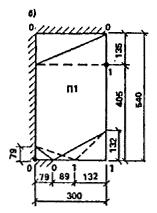 Рис. 13. 1-я схема излома элементов фрагмента 2.1. Расчет несущей способности отдельных сечений конструктивных элементов. 2.1.1. Панель наружной стены НС1. Расчетное сопротивление материалов определяют по указаниям п. 3 настоящего приложения. Бетон: Rbnyb2yb3/yb = 5,5/1,15 × 1,15 × 1,25 = 6,9 МПа; Rbt = Rbt,nyb2yb3yb = 0,7 × 1,15/1,25 × 1,25 = 0,805 МПа. Арматура диаметром 8 мм класса А-III Rs =390/l,05 × 1,1 = 408 МПа. Верхняя перемычка Несущая способность по изгибу верхней перемычки определяется по СНиП 203.01—84 при Аs = 1,508 см2 (3 стержня диаметром 8 мм из стали класса A-III); b = 35 см; h = 29 см; ho = 29 — 3 = 26 см. Сечение симметричное. Высота сжатой зоны x = (RsAs)/(Rbb) = (408 × 150,8)/(6,9 × 350) = 25,5 мм Несущая способность сечений М1 = М2 = Rbbx(ho ‑ 0,5x) = 6,9 × 350 ´ 25,5(260 ‑ 0,5 × 25,5) = 15,2 × 106 Н×мм = 15,2 кН×м. Невозможность хрупкого разрушения элементов наружной панели проверяется в соответствии с требованиями п. 5. При разрушении наружной стены так, как показано на рис. 13, б, величина поперечной силы, соответствующей возникновению предельных изгибающих моментов в верхней перемычке с коэффициентом 1,5, равна: Q = 1,5(M1 + М2)/lin = 1,5(15,2 + 15,2)/1,61 = 28,3 кН. Поперечное армирование составляют хомуты из 3 стержней диаметром 5 мм из стали класса Вр-1, шаг s = 200 мм: As = 0,59 см2; Rsw = 395/1,2 × 1,1 × 0,8 × 0,9 = 261 МПа. Прочность по наклонной полосе между наклонными трещинами проверяется из условия: Q £ 0,3jw1jb1Rbbh2o mw = Asw/(bs) = 59/(350 ´ 200) = 0,00084; a = Es/Eb = (17 × 104)/(16 × 103) = 10,6; jw1 = 1 + 5amw = 1 + 5 × 10,6 × 0,00084 = 1,04; b = 0,02; jb1 = 1 ‑ bRb = 1 ‑ 0,02 × 6,9 = 0,862; 0,3jw1jb1Rbbho = 0,3 × 1,04 × 0,862 × 6,9 × 350 × 260 = 169 000 Н = 169 кН > 28,3 кН. Условие прочности выполняется. Прочность по наклонной трещине проверяем по условию Q £ Qb + Qsw, где Qb = jb2(1 +jf + jn)Rbtbh2o/c, jb2 = 1,9; jf = 0; jn = 0; (1 + jf + jn) = 1. Проверка производится дважды: для с = 200 мм и для со. с = 200 мм, Qsw = 0; Qb = (l,9 × 0,805 × 350 × 2602)/200 = 180,9 × 103 = 180,9 кН > 28,3 кН. Условие прочности выполняется.