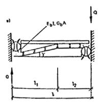 где lred — приведенный пролет перемычки lred = l + 0,6hlin, (18) l — пролет перемычки в свету; hlin — высота сечения перемычки; Eb,. Gb — соответственно, начальный модуль упругости и модуль сдвига бетона перемычки; llin, Alin — соответственно, момент инерции и площадь поперечного сечения перемычки. В случае таврового сечения (составного либо монолитного) за величину Alin принимается площадь сечения ребра перемычки на всю его высоту, включая толщину полки. 9. При использовании расчетной схемы диафрагмы в виде составного стержня с непрерывными продольными связями в формулы (16) и (17) вводят дополнительное слагаемое lw, учитывающее податливость примыкающих к перемычке простенков от изгиба и сдвига в пределах этажа lw = l1(s1/Het)2 + l2(s2/Het)2, (19) где l1(2) — коэффициент податливости левого (правого) простенка при местном изгибе и сдвиге в пределах этажа; s1(2) — расстояние от середины пролета перемычки в свету до оси левого (правого) простенка, в который защемлена перемычка; Het — высота этажа;