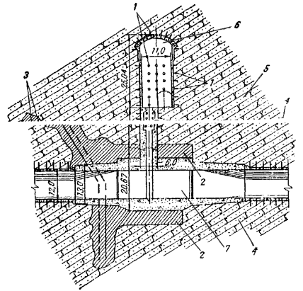 Рис. 46. Дренаж и противофильтрационная цементация в затворном узле строительного туннели, 1 яруса Нурекской ГЭС, (проект) 1 - шпуровые дрены Æ 50 мм; 2 - укрепительная цементация; 3 - противофильтрационная цементация; 4 - алевролиты; 5 - песчаники; 6 - помещение подъемных механизмов; 7 - камера затворов.