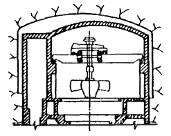 Рис. 78. Схема цементации и дренажа в подземной ГЭС, [Л. 10]: 1 - водоприемник; 2 - напорная шахта; 3 - подземное здание станции; 4 - противофильтрационная завеса; 5 - зона укрепительной цементации; 6 - шпуровой дренаж.