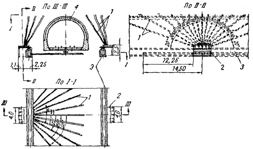 Рис. 42. Двусторонний лучевой дренаж, [Л. 16, 171, 172]: 1 - дренажные скважины; 2 - водоотводные лотки; 3 - защищаемый туннель; 4 - камеры для бурения.