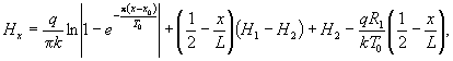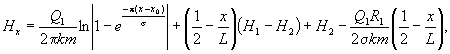 В этих формулах: Q - фильтрационным расход, притекающий в n дрен отрезка туннеля длиной L; k - коэффициент фильтрации породы; H = He - Hg - действующий напор; He - напор на контуре питания (на внешней границе области фильтрации); Hg - напор на контурах дрен; Hx - напор в расстоянии x от оси ближайшей дрены;