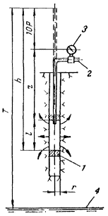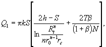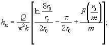 a - коэффициент, зависящий от конструкции скважин (при оборудовании их сетчатыми или гравийными фильтрами примерно равный 20, а при других типах фильтров примерно равный 7); Q1 - расход каждой скважины; S - понижение уровня воды в скважине; k - коэффициент фильтрации водоносного пласта; F - поверхность рабочей части фильтра, равная 2πrcl; R - радиус депрессии; rc - радиус скважины (колодца); σ - половина расстояния между скважинами; n - число скважин в контурной группе; r0 - расчетный радиус контурной группы скважин; rc и l - радиус и длина рабочей части фильтра. в) формула Ю.Г. Трофименкова для скважин несовершенного типа: