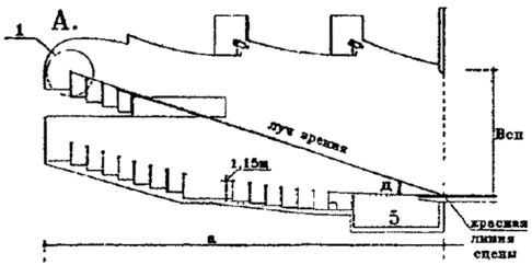 1) Красной линией сцены называется линия пересечения плоскости пола сцены с плоскостью строительного портала со стороны сцены. Требования данных таблиц действительны только для традиционной глубинной портальной сцены и не нужны для трехсторонней, сцены-арены и др. нетрадиционных типов сцен. 2) В условиях реконструкции показатель может быть изменен в зависимости от конкретных условий.