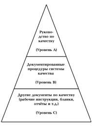 МЕЖДУНАРОДНЫЙ СТАНДАРТ ИСО 10013-95 РУКОВОДЯЩИЕ УКАЗАНИЯ ПО РАЗРАБОТКЕ РУКОВОДСТВ ПО КАЧЕСТВУ 1 Область примененияНастоящий международный стандарт содержит руководящие указания по разработке, подготовке руководств по качеству, адаптированных к конкретным потребностям пользователя, и по управлению ими. Полученные в результате руководства по качеству должны отражать документированные процедуры системы качества в соответствии с требованиями стандартов ИСО серии 9000. Настоящий стандарт не распространяется на детально разработанные рабочие инструкции, программы качества, брошюры и другие документы, относящиеся к системе качества (см. приложение А, уровень С). Примечание 1. Настоящий международный стандарт можно использовать для разработки руководств по качеству, связанных с другими стандартами на системы качества, помимо серии 9000. 2 Нормативные ссылкиПриведенный ниже стандарт содержит положения, которые путем ссылок в настоящем тексте составляют положения этого международного стандарта. На время публикации указанное издание было действующим. Все стандарты подлежат пересмотру, и сторонам соглашений, основанных на этом стандарте, рекомендуется изучить возможность применения самого последнего издания указанного ниже стандарта. Члены МЭК и ИСО ведут перечни текущих действующих международных стандартов. ИСО 8402-94 Управление качеством и обеспечение качества - Словарь. 3 ОпределенияПрименительно к настоящему международному стандарту используются определения, приведенные в ИСО 8402. 4 Документация систем качестваВ приложении А описана типичная иерархия документации системы качества. Порядок разработки этой иерархии в отдельной организации зависит от положения дел в этой организации, но, как правило, начинается с определения политики и целей организации в области качества. 4.1 Документированные процедуры систем качества Документированные процедуры систем качества должны составлять основную документацию, используемую при общем планировании и управлении деятельностью. влияющей на качество. Согласно стандартам ИСО серии 9000 эти документированные процедуры должны охватить все применяемые элементы стандарта на систему качества. Они должны описывать (с той степенью подробности, которая необходима для адекватного управления соответствующей деятельностью) ответственность, полномочия и взаимоотношения персонала, который руководит, выполняет, проверяет или анализирует работу, влияющую на качество: указывать, как следует выполнять различные виды работ, использовать документацию и осуществлять контроль (см. приложение А). 4.1.1 Область применения процедур. Каждая документированная процедура должна распространяться на логически отделяемую часть системы качества, такую, как завершенный элемент системы или его часть, либо последовательность взаимосвязанных действий, относящихся к нескольким элементам системы качества. Количество документированных процедур, объем каждой из них и характер их оформления и представления должны определяться пользователем настоящего международного стандарта; каждая процедура обычно отражает сложность используемых средств, организации и характера предпринимательской деятельности. Документированные процедуры системы качества не должны, как правило, вдаваться в чисто технические де