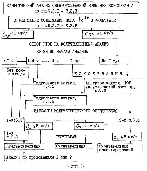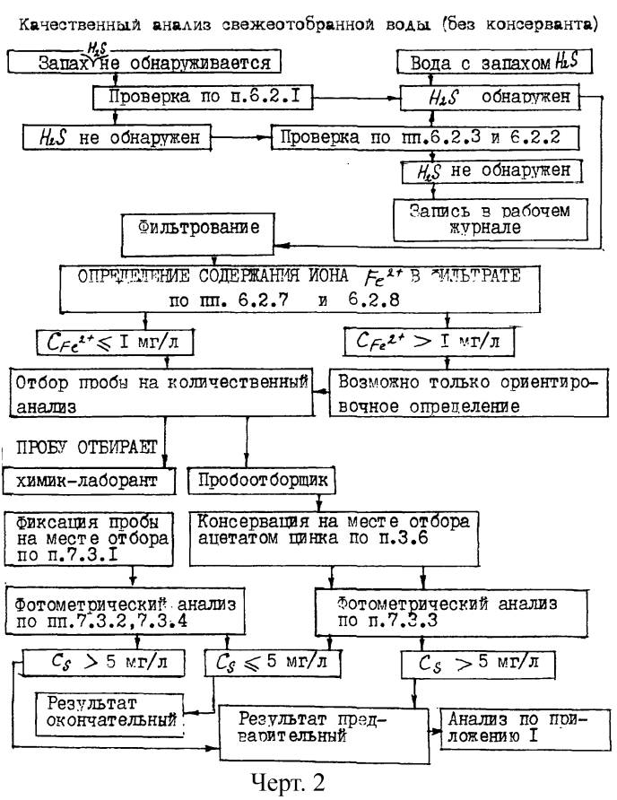 Величина 9. Требования безопасности9.1. Общие требования по безопасному ведению работ на месторождениях, в газе которых объемное содержание сероводорода не превышает 6%, должны соответствовать "Инструкции по безопасности работ при разработке нефтяных, газовых и газоконденсатных месторождений, содержащих сероводород", утвержденной Госгортехнадзором СССР 5 декабря 1977 г. Свойства и действие сероводорода на человека, оказание доврачебной помощи пострадавшим при отравлении сероводородом, приборы для контроля концентрации и средства индивидуальной защиты приведены в приложениях 1, 2, 3 и 5 "Инструкции по безопасности работ при разработке нефтяных, газовых и газоконденсатных месторождений, содержащих сероводород", утвержденной Госгортехнадзором СССР 5 декабря 1977 г. 9.2. На месторождениях, где объемное содержание сероводорода в газе превышает 6%, следует принимать дополнительные меры предосторожности согласно "Инструкции по безопасному ведению работ при разведке и разработке нефтяных, газовых и газоконденсатных месторождений с высоким содержанием сероводорода и других вредных и агрессивных веществ", утвержденной Госгортехнадзором СССР 17 июня 1982 г. 9.3. Лица, занимающиеся отбором проб, должны пройти специальный инструктаж. 9.4. Все работы, проводимые в химических лабораториях, должны осуществляться в соответствии с "Основными правилами работы в химических лабораториях". - М.: Химия, 1979 г. - 88 с. 9.5. Категорически запрещается получение газообразного сероводорода вне вытяжного шкафа или в условиях неисправной работы вентиляции. 9.6. Следует помнить, что реактив А содержит серную кислоту. Изменением N 1, утвержденным приказом Министерства нефтяной и газовой промышленности СССР от 6 июня 1990 г. N 256 в настоящее приложение внесены изменения, вступающие в силу с 1 ноября 1990 г. Приложение 1(обязательное) Схема анализа воды при суммарном содержании сероводорода и его ассоциатов по текущим анализам более 5 мг/л(с изменениями от 6 июня 1990 г.)