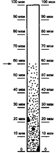 Рисунок 4 - Графическое изображение оценки результатов (частицы); результат - 18 мкм После каждого определения необходимо сразу же очистить прибор и скребок соответствующим растворителем. 6.7. Степень перетира густотертых и водно-дисперсионных красок, а также шпатлевок определяют по границе начала штрихов, если нет других указаний в нормативных или технических документах на испытуемый материал. 6.8. Границу начала штрихов, расположенных в направлении от большего деления шкалы к