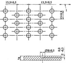 Примечание. Установленное значение глубины среза по периметру окаймления фторопласта дано для облегчения измерения высоты выступа фторопласта hф после установки и при обследовании опорных частей. Рис. 2. Элементы углубления фторопластовых пластин: 5.2.3. Фторопластовые пластины должны иметь ячейки для заполнения смазкой. Фторопластовые полосы направляющих деталей выполняют без ячеек для смазки. Форма и расположение ячеек для смазки в ненагруженном состоянии показаны на рис. 3. Шаблон ячеек должен быть расположен по основному направлению скольжения. Размеры