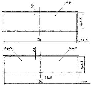 2,2×hф £ tф £ 8 мм. (2) Допуск на выступающую часть фторопласта из выточки hф равен ± 0,2 мм при Dф меньше или равной 1200 мм и ± 0,3 мм при Dф больше 1200 мм (см. Пример Д.1). 5.2.7. Плоские фторопластовые пластины должны быть круглой или прямоугольной формы и могут быть разделены максимум на четыре одинаковые части. Минимальный размер аф должен быть 50 мм. Примеры разделения фторопластовых пластин приведены в приложении В. Прямоугольные фторопластовые пластины применяют в резинофторопластовых опорных частях. 5.2.8. Фторопластовые пластины для сферических поверхностей скольжения должны быть круглыми и могут быть разделены на диск и кольцо. Диаметр диска принимают не менее 1000 мм, а ширину кольца не менее 50 мм. Кольцо может быть поделено на равные сегменты. Ширину разделительного кольца нижнего балансира принимают 10 мм (рис. 4). 5.2.9. Фторопластовые пластины для направляющих элементов выполняют в виде полос шириной не менее 15 мм (рис. 5). Минимальную толщину фторопластовых пластин направляющих элементов, уложенных в выточки, принимают 5,5 мм, а выступающую часть в ненагруженном состоянии 2,5 ± 0,2 мм. Размеры