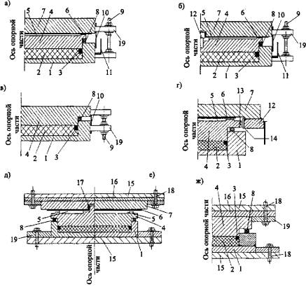 направляющей: 6.3.8. В неподвижной сферической опорной части для обеспечения поворотов внутренний диаметр кольцевого фиксатора должен быть на 2 мм больше диаметра нижнего балансира, контактирующего с фиксатором. 6.3.9. Необходимо снабжать опорные части транспортными, анкерными, такелажными деталями, а также защищать от атмосферных воздействий и коррозии (см. 6.2 и 6.5). 6.4. Резинофторопластовые опорные части6.4.1. Резинофторопластовые опорные части по функциональному назначению подразделяют на всесторонне-подвижные и линейно-подвижные. Всесторонне-подвижная резинофторопластовая опорная часть состоит из деформируемой детали в виде резиновой армированной опорной части соответствующего типоразмера, передающей вертикальную нагрузку и обеспечивающей угловые перемещения опорных узлов пролетных строений, и пары скольжения, обеспечивающей линейные перемещения. Линейно-подвижная резинофторопластовая опорная часть включает дополнительно направляющие элементы. 6.4.2. В качестве элементов скольжения используют фторопласт и полированную нержавеющую сталь. В направляющих элементах линейно-подвижных опорных частей в качестве пары трения используют полированную нержавеющую сталь - фторопласт или металлофторопласт. 6.4.3. Область применения опорных частей определяют в зависимости от марки резины, используемой в резиновой опорной части, согласно 3.6. 6.4.4. Стальной лист с выточками, в которых располагаются фторопластовые пластины, может быть привулканизирован к резиновой опорной части при ее изготовлении или свободно располагаться на ней (рис. 16). Для предотвращения смещения стальной лист, свободно расположенный на резиновой опорной части, должен по периметру иметь ограничители высотой не менее 10 мм. Направляющие элементы линейно-подвижных опорных частей могут располагаться как в центре стального листа (рис. 16, а, г), так и снаружи (рис. 16, в, е).
