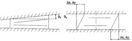 непроклеем по торцам стальных листов под нагрузкой: При обнаружении этих дефектов резиновая опорная часть подлежит замене. 13.3. Наличие клиновидного зазора между резиновой опорной частью и опорной площадкой пролетного строения или балки не допускается. Для устранения этого дефекта следует установить клиновидную или плоскую стальную прокладную плиту, а шов между плитой и опорным узлом заполнить материалами по СНиП 3.06.04-91, Приложение 11. 13.4. Угол сдвига и направление сдвига боковых поверхностей резиновых опорных частей должны соответствовать указанным в проекте с учетом температуры воздуха, при которой пролетные строения (балки, плиты) были установлены на опорные части, температуры замыкания температурно-неразрезных пролетных строений и температуры воздуха, при которой выполняют приемку сооружения. 13.5. После установки каждой стаканной, сферической или резинофторопластовой опорной части следует выполнить начальные замеры функционального зазора скольжения (высоту выступающего из выточки фторопласта) и угла поворота. Зазоры скольжения замеряют в нескольких точках по периметру фторопластового диска. Угол между плоскостями, в которых расположены скользящая плита (крышка) и основание опорной части, не должен превышать величины, указанной в проекте. Величину угла поворота определяют замером расстояния между скользящей плитой (крышкой) и основанием опорной части, как вдоль, так и поперек оси мостового сооружения. Толщину выступающей части фторопластовых дисков и величину угла поворота фиксируют в акте. 13.6. Обследование и содержание опорных частей в мостовых сооружениях необходимо выполнять в соответствии с указаниями СНиП 3.06.07-86 и ВСН 4-81. 13.7. При обследовании опорных частей необходимо убедиться в прочности подферменников - отсутствии в них трещин и сколов, а также в отсутствии трещин, местных изгибов, неровностей в элементах опорных узлов несущих конструкций, трещин в опорах. 13.8. Резиновые (резинофторопластовые) опорные части обследуют визуально по 13.2, а также выполняют замеры величин сдвига и углов поворота как вдоль, так и поперек оси мостового сооружения (см. рис. 24). Значения Dх, Dу, Jx, Jу фиксируют в акте обследования с указанием температуры воздуха во время обследования.