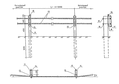 Рабочий участок (11ДО - ТЖ.5) 11 - стойка СД-8; 12 - канат Ø 19,5 мм; 13 - компенсатор КС; 14 - шайба; 15 - болт; 16 - гайка; 17 - элемент фиксирующий (Ø 12 AI, l = 900, 0,8 кг); 19 - световозвращатель