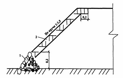 Рис. 18. Плетневое прорастающее укрепление: 1 - двухкомельные фашины; 2 - ивовые колья толщиной 0,06 м Прорастающие плетни наиболее устойчивы против размывающего действия потока и раньше других видов посадок начинают проявлять свои гидротехнические свойства, но стоимость их выше, чем остальных видов посадок. Для плетневой посадки применяются прутья длиной 1 м, толщиной на комле 0,04 - 0,05 м, хлысты длиной 2 м, толщиной на комле 0,03 - 0,04 м. Посадка прутьев производится в канавку глубиной 0,5 - 0,6 м, шириной по верху 0,5 м, по дну 0,3 м. В дно канавы устанавливают плетень с наклонной заплеткой живых хлыстов. Концы кольев и хлыстов выпускают наружу, при этом хлысты должны возвышаться над концами кольев на 0,3 - 0,4 м. Канавку и плетень засыпают растительной землей и утрамбовывают. Минимальное расстояние между плетнями принимается 2 м, в исключительных случаях -1,5 м. Для экономии посадочного материала посадка может производиться не сплошной, а лентами шириной 0,7 - 0,8 м или перекрещивающимися лентами, что создает более устойчивое укрепление от сползания. Посадка кустарника должна производиться ранней весной до начала сокодвижения или осенью после его прекращения, но до замерзания почвы. На поймах рек с весенними паводками начало весенней посадки определяется временем освобождения поймы от воды. Для надежного приживления все посадки нуждаются в 4 - 5-кратном рыхлении земли вокруг них, уничтожении сорняков и периодической подрезке. Для защиты откосов в период произрастания посадок, при необходимости, применяют временные недорогие укрепления. Хворостяная прорастающая выстилка Хворостяная прорастающая выстилка является временным типом укрепления в комбинации с посадками и применяется в случаях, когда до прорастания откос не может быть оставлен без укрепления [12]. Материалом для выстилки служит хворост, способный к прорастанию. Хворост укладывается по поверхности откоса равномерно слоем толщиной 0,2 - 0,3 м комлями вниз. Для обеспечения прорастания в откосе делают продольные уступы, в которые укладывают комли хвороста и засыпают землей слоем толщиной 0,1 м. При большой длине откоса выстилка делается в несколько рядов. Сначала укладывается верхний ряд по всему откосу, затем следующий ряд с напуском на ранее уложенный, примерно на 1/3 длины хворостин, и таким же образом все последующие. Хворост закрепляется рядами хворостяных канатов, прикрепляющихся к откосу колышками, пробивающими слой хвороста и каната и заглубляющимися в грунт. Канаты укладываются на расстоянии 0,5 м от комлей. Расстояние между канатами 1 м. Гидропосев семян трав Наиболее результативным и перспективным способом восстановления нарушенных земель и защиты от поверхностной эрозии элементов инженерных сооружений является биологический метод рекультивации [12]. Известно, что естественным образом в первую очередь возобновляется сорная растительность, не создающая дернину на поверхности почвы. Нарушенный дерновый покров возобновляется естественным путем через 10 - 15 лет. Посевом многолетних трав его можно создать через 2 - 3 года. Искусственное задернение полосы отвода магистральных газопроводов и откосов инженерных сооружений уменьшает, развитие эрозионных процессов и создает конкуренцию росту нежелательной древесно-кустарниковой растительности. К биологическим типам конструкций ук