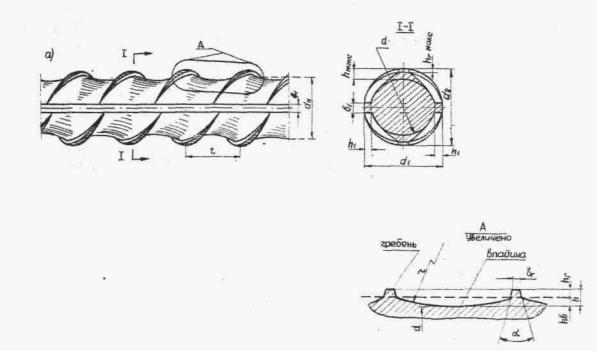 1.2. Арматурная сталь со специальным периодическим профилем представляет собой круглые стержни с двумя продольными ребрами и чередующимися по длине стержня гребнями и полукруглыми впадинами, идущими по трехзаходной линии. Очертания и размеры впадин вдоль винтовой линии постоянны. Высота гребней вдоль винтовой линии изменяется.