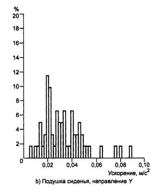 На рисунке А.4 показаны гистограммы распределения среднеквадратичных значений корректированного ускорения (время интегрирования - 5 мин) на подушке и спинке сиденья, полученных с использованием функций частотной коррекции в соответствии с ГОСТ 31191.1. Для измерений ускорения в вертикальном направлении была использована функция частотной коррекции Wk.