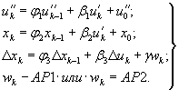 где ρ, μ, η, - коэффициенты соответствующих авторегрессий; ξk - некоррелированный процесс, называемый белым шумом. Выбор AP1 или АР2 выполняется в зависимости от характера изменения остаточных погрешностей построения модели (1) и показан в Приложении 3. 4.11. Матричное выражение модели (1), используемой, например, совместно с моделью (2), будет представлять, по существу, рассматриваемые модели в пространстве состояний. При этом вектор состояний оказывается расширенным за счет включения модели шумовой компоненты. Динамическая модель, выраженная в пространстве состояний, имеет следующий общий вид: Xk = ФXk-1 + BUk + Гξk, (4) где Xk = [x1,k, x2,k, ωk]T - вектор состояний, xi,k = x(k-i+1), i = 1,2,3;