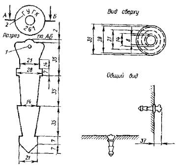 Размеры даны в см Примечание. Центр закладывается бурением или протаиванием грунта, как правило, на незастроенной территории, а также на застроенной территории там, где невозможна установка стенного знака и допустимо производство буровых работ. После пробуривания скважины нижняя часть ее до высоты 50 - 60 см заполняется грунтом текучей консистенции, в который и погружается многодисковый якорь до основания скважины