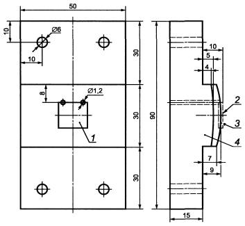 1 - лицевая поверхность; 2 - захват; 3 - скобка Рисунок 6 - Испытуемый образец Вырезают не менее 10 испытуемых образцов. Испытуемый образец кондиционируют не менее 24 ч при относительной влажности (65 ± 2) % и температуре (20 ± 2)°С в соответствии с требованиями [2]. 6 Метод определения устойчивости к воздействию брызг расплавленного металлаМеры безопасности Под воздействием расплавленного металла органические материалы могут разлагаться с образованием вредных веществ. Поэтому испытания в соответствии с данным методом необходимо проводить в камере, где возможно включение воздушной вытяжки после завершения каждого опыта. Необходимо пользоваться защитными перчатками перед тем, как брать горячие предметы. Если во время проведения испытаний требуется тщательный осмотр устройства или образца, то необходимо обеспечивать защиту глаз и лица. Под образцом следует устанавливать соответствующий каплеуловитель. 6.1 Условия проведения испытанийИспытания проводят в защищенном от сквозняков помещении, без источников тепла, за исключением тех, которые требуются для испытаний. Температура в помещении во время проведения испытаний с каждым образцом не должна изменяться более чем на ± 5 К. Перед проведением испытаний температуру датчика (изолирующей опоры и образца) доводят до температуры окружающей среды с предельно допустимым отклонением ± 2 К. 6.2 Подготовка и регулирование металлического стержняРасход (10 ± 1) г/мин стального стержня в соответствии с 4.5 обеспечивается соответствующей скоростью мотора. Положение сварочной горелки и расход газов регулируют для обеспечения образования капель массой m при частоте f. Массу капли m определяют взвешиванием стержня до и после расплавления 20 капель и деления разницы в массе на 20. Частоту определяют по времени, определенному по секундомеру, которое необходимо для образования данного количества капель, исключая время до образования первой капли. Для расчета в соответствии с 6.3 масса капли m и частота f должны быть следующими: - m = (0,50 ± 0,03) г; - f = 20 капель за (60 ± 3) с. В качестве начальных условий рекомендуются следующие: - давление кислорода - 250 кПа1) (250∙103 Н/м2); - давление ацетилена - 50 кПа (50∙103 Н/м2); - расстояние от стержня до сопла горелки - - высота темно-голубого конуса пламени - 1) 1 кПа = 103 Н/м2. Рекомендуется также пользоваться минимально возможными расходами газов для минимизации риска сдувания или разбрызгивания капель пламенем. Стержень необходимо устанавливать в самом горячем месте пламени, то есть непосредственно на острие темно-голубого конуса. 6.3 Порядок проведения испытанийДержатель образца в соответствии с 4.4 размещают так, чтобы вертикальное расстояние между центром сопла горелки и центральной горизонтальной линией датчика в соответствии с 4.3 составляло (110 + 10) мм. Расстояние по горизонтали между осью стержня и вертикальной плоскостью поверхности датчика устанавливают равным (60 ±10) мм. Расстояние между осью стержня и плоскостью, проходящей через центральную вертикальную линию датчика перпендикулярно к его поверхности, устанавливают равным (15 ± 10) мм со стороны, противоположной соплу горелки (см. рисунок 1). Направляющее приспособление для капель в соответствии с 4.2 наклоняют на 45°; при этом необходимо убедиться, что капли металла легко улавливаются и летят на испытуемый образец на уровне датчи