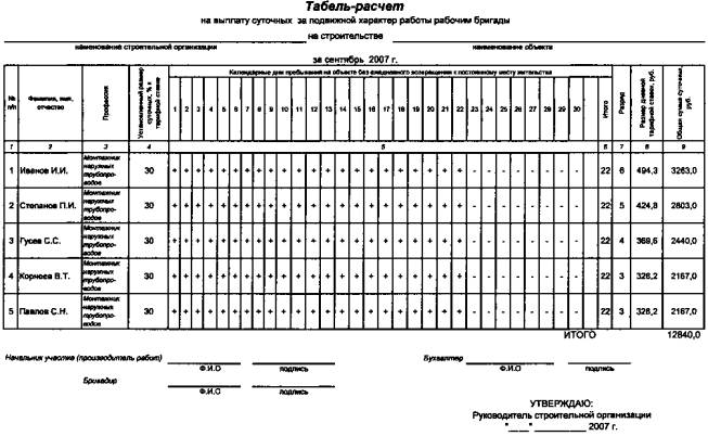 Локальным нормативным актом суточные при командировках установлены в размере 300 руб. Бригада монтажников наружных трубопроводов 22 дня в сентябре Расчетная дневная ставка рабочего: - 3-го разряда: 59,5 руб.×165,5/30 = 328,24 руб. - 4-го разряда: 67 руб.×165,5/30 = 369,6 руб. - 5-го разряда: 77 руб.×165,5/30 = 424,8 руб. - 6-го разряда: 89,6 руб.×165,5/30 = 494,3 руб. Суточные за подвижной характер работы: - рабочему 3-го разряда: 328,24 руб.×0,3 = 98,5 руб. - рабочему 4-го разряда: 369,6 руб.×0,3 = 110,9 руб. - рабочему 5-го разряда: 424,8 руб.×0,3 = 127,4 руб. - рабочему 6-го разряда: 494,3 руб.×0,3 = 148,3 руб. Сумма суточных за 22 дня составит: - рабочему 3-го разряда: 98,5 руб.×22 = 2167 руб. - рабочему 4-го разряда: 110,9 руб.×22 = 2440 руб. - рабочему 5-го разряда: 127,4 руб.×22 = 2803 руб. - рабочему 6-го разряда: 148,3 руб.×22 = 3263 руб. Количество календарных дней пребывания бригады рабочих на объекте без ежедневного возвращения к постоянному месту жительства и расчеты на выплату суточных за подвижной характер работ сводятся в Табель-расчет (форма 1). б) для руководителей, специалистов и других служащих: Месячные должностные оклады руководителей, специалистов и других служащих этой же строительной организации установлены в следующих размерах: Производитель работ 22000 руб. Мастер 18000 руб. Главный специалист 20000 руб. Ведущий специалист 15000 руб. Суточные за подвижной характер работы на этих объектах строительства предусмотрены в размере 30 процентов должностного оклада. Руководители и специалисты в сентябре Суточные за подвижной характер работы составят: - Производителю работ: 22000 / 30×0,3 = 220 руб. - Мастеру: 18000 / 30×0,3 = 180 руб. - Главному специалисту: 20000 / 30×0,3 = 200 руб. - Ведущему специалисту: 15000 / 30×0,3 = 150 руб. Сумма суточных за 20 дней составит: - Производителю работ: 220 руб.×20 = 4400 руб. - Мастеру: 180 руб.×20 = 3600 руб. - Главному специалисту: 200 руб.×20 = 4000 руб. - Ведущему специалисту: 150 руб.×20 = 3000 руб. Количество календарных дней пребывания руководителей и специалистов на объекте без ежедневного возвращения к постоянному месту жительства и расчеты на выплату суточных за подвижной характер работ сводятся в Табель-расчет (форма 2).