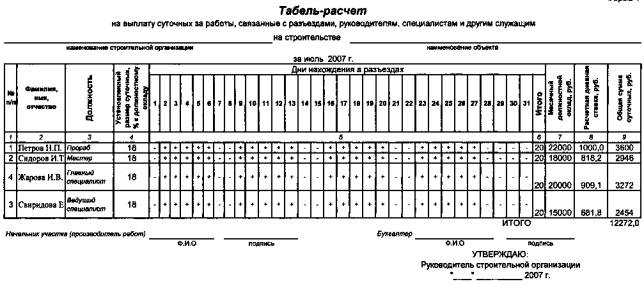 Приложение 1Порядок учета и выплаты суточных за подвижной характер работыУчет календарных дней пребывания рабочих на работах, имеющих подвижной характер, ведется по табелю-расчету (форма 1), а руководителей, специалистов и других служащих - по табелю-расчету (форма 2). Суточные за каждый календарный день пребывания работника на работах, имеющих подвижной характер, исчисляются в следующем порядке: - для работников, оплачиваемых по окладам: месячный должностной оклад делится на количество календарных дней в расчетном месяце, полученный результат умножается на рекомендуемый в п. 2.3 Методических рекомендаций размер суточных. Суточные за месяц исчисляются путем умножения суточных за подвижной характер работы за каждый календарный день на количество календарных дней пребывания работника на объекте. Пример 1 Главный специалист сметного отдела в течение июня В этом случае суточные за подвижной характер работ за каждый календарный день составят: 18000/30×0,3 = 180 руб. Сумма суточных за 8 дней составит: 180 руб.×8 = 1440 руб. - для рабочих, которым установлены часовые тарифные ставки, месячная тарифная ставка определяется путем умножения часовой тарифной ставки на среднемесячное количество рабочих часов в соответствующем году. Дальнейший расчет производится в том же порядке, что и у работников, оплачиваемых по месячным окладам. Пример 2 Рабочий 3-го разряда в июне Суточные за подвижной характер работ определяются в следующем порядке: (62,5×165,5 / 30)×0,3 = 103,44 руб. Сумма суточных за 15 дней составит: 103,44 руб.×15 = 1551,6 руб. - для рабочих, которым установлены дневные тарифные ставки: дневная тарифная ставка умножается на среднемесячное количество рабочих дней соответствующего года и делится на количество календарных дней в расчетном месяце. Полученная сумма умножается на соответствующий процент суточных за подвижной характер работы. Суточные за месяц исчисляются путем умножения суточных за подвижной характер работы за каждый календарный день на количество календарных дней пребывания рабочего на объекте. Пример 3 Рабочий 4-го разряда, которому установлена дневная тарифная ставка 300 руб., в августе Суточные за подвижной характер работ при 40-часовой рабочей неделе определяются в следующем порядке: (300 руб.×20,75 / 31)×0,4 = 80,32 руб. Сумма суточных за 15 дней составит: 80,32 руб.×15 = 1204,8 руб. Порядок учета и выплаты суточных за разъездной характер работУчет ежедневных поездок в нерабочее время от места нахождения работодателя (пункта сбора) и обратно ведется отдельным табелем: - для рабочих - по бригадам на бланке табеля-расчета (форма 3); - для руководителей, специалистов и других служащих - на бланке табеля-расчета (форма 4). По истечении месяца начальник участка (производитель работ, а при его отсутствии - мастер) представляет в бухгалтерию строительной организации табель-расчет, служащий основанием для начисления суточных. Бухгалтерия на основании табеля-расчета дней выездов работников на отдаленные стройки исчисляет суммы причитающихся суточных и после утверждения их руководителем строительной организации или его заместителем выплачивает суточные. - При определении размера суточных для рабочих, которым установлены часовые тарифные ставки, необходимо часовую тарифную ставку присвоенного рабочему разряда умножить на среднемесячное количество рабочих часов в 
