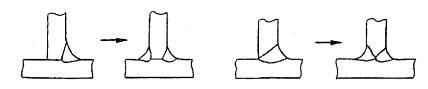 Рисунок 5.2 - Изменение форм разделки кромок и поперечного сечения шва 5.3 Снижение величины сварочных напряжений и деформаций можно достигнуть уменьшением объема и концентрации наплавленного металла. Для этого рекомендуется: - избегать увеличения размеров поперечного сечения сварных швов, более тех, что обусловлены расчетами на прочность; - применять симметричные угловые швы, вместо швов с односторонней разделкой кромок (рисунок 5.3); - заменять односторонние угловые швы на двусторонние симметричные (рисунок 5.4).