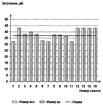 где F1, F2 - любые частоты низкочастотного диапазона; b1, b2 - затухание на частотах F1 и F2 соответственно. Это соотношение не зависит от длины кабеля. В том случае, если АЧХ не соответствует нормам, но зависимость затухания от частоты примерно сохраняется, причиной превышения нормы является повышенная длина кабельных участков, по сравнению с допустимой, принятой в соответствии с проектными нормативами. Если же соотношение (1) нарушается и АЧХ загибается кверху на более высоких частотах, то наиболее вероятной причиной превышения нормируемого значения является замокание кабеля. На рисунке 4 показано изменение затухания на частоте 2400 Гц для каждого измерительного сеанса. Как следует из рисунка, практически в каждом сеансе наблюдается значительное превышение нормируемого значения. На рисунке 5 показано изменение затухания на частоте 1800 Гц для каждого измерительного сеанса. Как следует из рисунка во многих сеансах нормируемое значение параметра превышено. На рисунке 6 показано изменение затухания на частоте 1020 Гц. Во всех измерительных сеансах затухание соответствует заданной норме. На физических линиях АЧХ монотонно возрастает с ростом частоты. Полученные результаты показывают, что направление связи, взятое для примера, организовано на базе физической линии. Подставив в формулу (1) значения затухания на частотах 1020 Гц и 2400 Гц отмечаем, что в рассмотренном случае зависимость затухания от частоты нарушена, поэтому имеет место повреждение физической линии. На рисунке 7 приведена амплитудно-частотная характеристика коммутируемого канала направления связи, на котором обнаружено замокание кабеля. На участках, где используются каналы систем передачи, наиболее вероятной причиной нарушения АЧХ является недопустимо большое число последовательно включенных каналов. Такая ситуация наиболее вероятна на междугородных участках сети. Из всех типов систем передачи наибольшую опасность представляют системы с частотным разделением каналов (К-60, К-120, К-1920, Р-600 и т.д.), в которых с целью уменьшения межканальных переходов используются кварцевые фильтры с весьма крутыми срезами. В системах передачи КРР, "Кама" и системах передачи с временным разделением каналов (типа ИКМ) используются фильтры с более пологими срезами, последовательное включение которых, как правило, не приводит к существенному искажению АЧХ. Подозреваемый участок отыскивается путем проведения измерений в различных направлениях от станции, осуществляющей поиск. Для определения участка, приводящего к искажению АЧХ, целесообразно разделить составные каналы на более короткие участки, например, на местные участки на исходящем и входящем концах направления и междугородный участок. 6 Соотношение уровней сигнала и шума6.1 Виды помехВ коммутируемых каналах измеряют интегральный параметр соотношения уровня сигнала и суммарной мощности шумов - помех. Все виды помех можно разделить на две группы: аддитивные и мультипликативные помехи. Аддитивные помехи проявляются в свободном от сигнала канале, мультипликативные помехи проявляются в канале, загруженном сигналом. Для телефонных переговоров опасны аддитивные помехи, для документальной электросвязи оба вида помех примерно равноценны. Поэтому для эксплуатационных измерений коммутируемых каналов целесообразно нормировать сумм